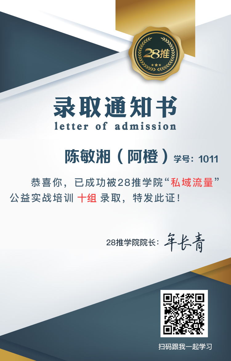我的推廣值上去,同時,我被錄取了。這一次的肯定,就像一個大大的印章,在我身上刻上了四個大字,“你可以的”。我可以的,我真的可以,我也太可以了!