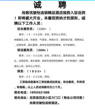 > 岳西尚客優(yōu)駿怡連鎖精品酒店招聘信息