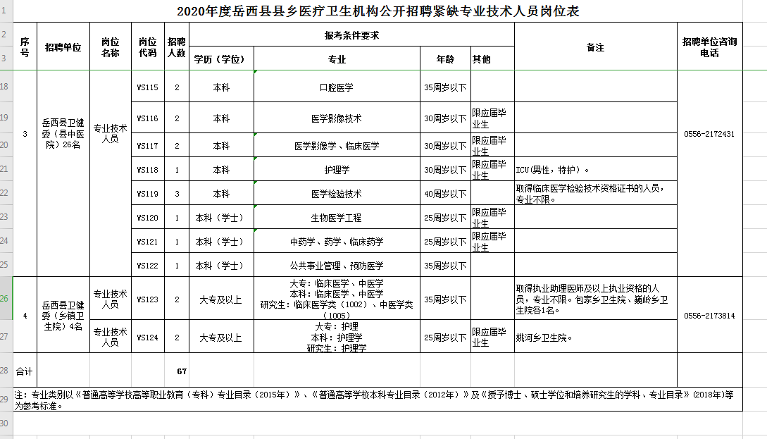 招聘單位電話見《2020年度岳西縣縣鄉(xiāng)醫(yī)療衛(wèi)生機(jī)構(gòu)公開招聘緊缺專業(yè)技術(shù)人員崗位表》。
