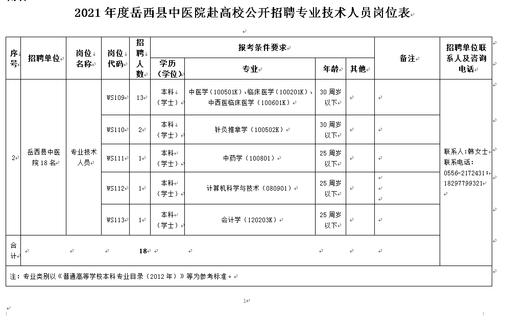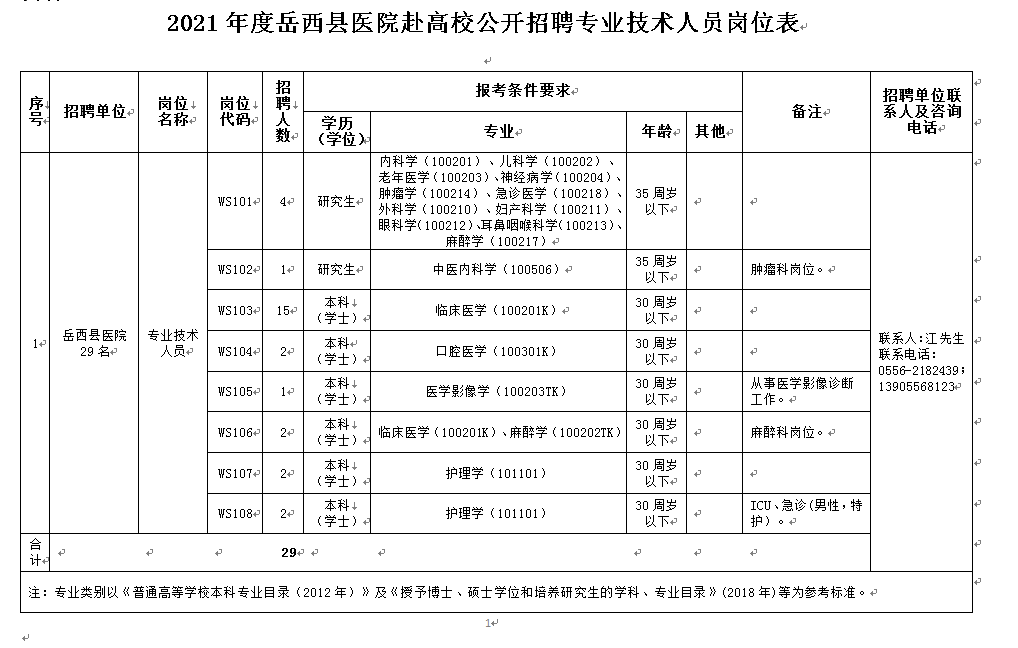 具體招聘崗位、人數(shù)、報(bào)考條件等詳見附件1《2021年度岳西縣醫(yī)院赴高校開招聘專業(yè)技術(shù)人員崗位表》、附件2《2021年度岳西縣中醫(yī)院赴高校開招聘專業(yè)技術(shù)人員崗位表》。